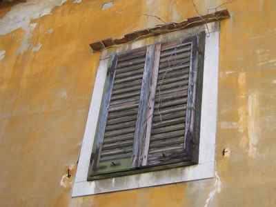 Fascia basamentale in finto bocciardato con intera facciata e androna d'ingresso intonacate color giallo. Finti conci in rilievo intonacati ai lati del corpo centrale. Portone inserito in un foro ad arco a tutto sesto e composto da un'intelaiatura lignea con battente a doppia specchiatura nella parte inferiore e doppie specchiature ai lati; due cippi in pietra bianca bulinata alla base dei piedritti del foro (IMG_0808). Serramenti esterni tutti in legno a quattro specchiature, ma di diverse tipologie: al piano terra fori quadrati a doppia specchiatura con cornice in pietra bianca bulinata, in cui è inserita un'inferriata in ferro, sovrastati da gocciolatoi in mattoni e tavelle di terracotta (IMG_0803); al piano superiore fori rettangolari a sei specchiature con cornici in pietra bianca bulinata e gocciolatoi in tavelle di terracotta (IMG_0802). Fori del primo piano privi di grate, ma muniti di oscuranti, sempre in legno. Il foro circolare dell'ultimo livello con cornice in mattoni e serramento di forma quadrata presumibilmente in alluminio. Terrazzo cinto da pilastrini in pietra, ringhiera in ferro e struttura in ferro a formare un pergolato al piano superiore del lato volto a valle. Androna pavimentata con lastroni di pietra arenaria e coperta solo in parte causa il crollo del solaio sovrastante (IMG_0820). Sulla sinistra tre porte d'accesso al volume laterale: tutte con cornice in pietra bianca bulinata, le prime due con sopraluce anch'esso con cornice di ugual fattura. Sul fondo si apre un arco uguale e simmetrico a quello del portone d'entrata. Sulla destra altri due archi uguali a quelli sopra descritti: uno, attraverso un scala in pietra, porta alla porzione di parco che sta a valle, l'altro ad un cortile interno. Nel mezzo una porta in ferro sovrastata da un travetto in acciaio posto da architrave (IMG_0822). Accanto al portone un'altra porta con cornice in pietra bianca bulinata che conduce ai locali dei volumi laterali. Pluviali esterni alla muratura perimetrale in ferro così come la gronda.