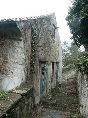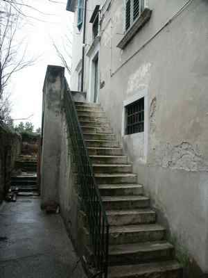Corpo edilizio settecentesco posto alle pendici del colle di S. Giusto, integrato nel borgo della città vecchia. Sviluppo su due piani fuori terra, più sottotetto e piano seminterrato ad uso cantina. Articolazione in due corpi di fabbrica disposti ad "L" a formare un cortile interno con accesso indipendente, delimitato sugli altri lati da muri di contenimento a strutture arcuate in pietra arenaria. Distribuzione interna caratterizzata da un unico vano scala. Strutture portanti verticali in muratura di pietrame a sacco, murature perimetrali in pietra arenaria sbozzata a corsi suborizzontali; solai in volte di elementi di laterizio in corrispondenza dei corridoi di distribuzione interna, strutture orizzontali lignee in corrispondenza degli appartamenti privati. Strutture di copertura lignee con manto in coppi curvi rossi. Scala con elementi in pietra appoggiati su muratura portante laterale e setto centrale. Scala esterna in pietra di accesso al piano terra rialzato. Facciate trattate in maniera omogenea su tutti gli affacci.