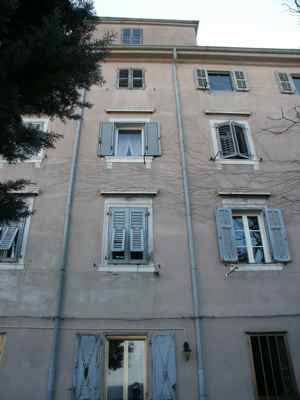 ELEMENTO ORNAMENTALE (esterno) Inferriate in ferro battuto decorate da motivi geometrici in corrispondenza dei fori architettonici del piano terra. AFFRESCO (interno) Nell'atrio d'ingresso, raffigurazione parietale di S. Giusto protettore e patrono della città (PICT0191.JPG), raffigurata nelle sue mani, con chiara identificazione della cattedrale sul colle, delle mura medievali, della città esistente al loro interno e, forse nell'angolo sinistro vicino alla stessa cattedrale l'edificio stesso in cui si trova l'affresco.