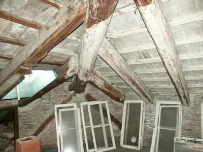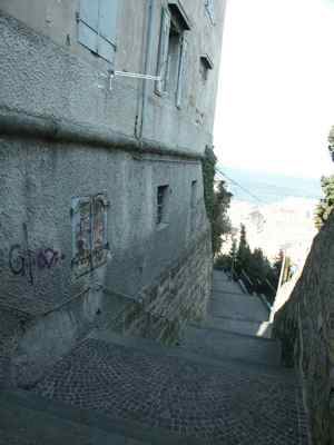 Corpo edilizio posto alle pendici del colle di S. Giusto, integrato nel borgo della città vecchia. Si sviluppa su quattro piani fuori terra, attico sopraelevato e livello interrato ad uso cantina. Strutture portanti verticali in muratura a sacco di pietra arenaria sbozzata a corsi suborizzontali, in mattoni pieni di laterizio in corrispondenza della sopraelevazione dell'attico. Orizzontamenti con strutture ad orditura singola e tavolato ligneo. Scala con elementi in pietra appoggiati su muratura portante laterale e setto centrale. Vani di servizio con affaccio diretto al vano scala in corrispondenza dei pianerottoli di interpiano. Copertura con puntoni appoggiati alla trave di colmo; orditura secondaria costituita da arcarecci e tavelle in cotto; manto di copertura in coppi curvi rossi. Facciate trattate in modo uniforme, basamento in pietra lungo l'intero corpo di fabbrica.