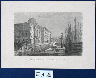 L'edificio venne realizzato nel 1839 su progetto dell'architetto Giovanni Degasperi, sul sito in cui sorgeva l'antica Cappella Rossetti. In origine intitolato al principe Metternich, assunse il nome di Hôtel de la Ville solo nel 1871. L'albergo, inaugurato il 1° giugno del 1841, ospitò personaggi importanti, come conti, ambasciatori, artisti, tra cui Giuseppe Verdi nel 1850, il re Ottone di Grecia nel 1858, fino a Gabrile D'Annunzio nel 1902. L'albergo era dotato anche di bagni pubblici, di acqua dolce, del Grande Ristorante con vista sul mare e del Cafè Divan, aperto nel 1839. Al 1860 risalgono i rettangoli scolpiti a bassorilievo sul pianterreno rappresentanti una decina di figure allegoriche, opera degli scultori Giuseppe Moscotto e Giovanni Depaul. Tale decorazione voluta dal mecenate Pasquale Revoltella si affiancava alla serie di tondi a rilievo dello scultore Pietro Zadomeneghi. Nel 1888 vennero apportate delle modifiche al pianoterra. Lavori di ristrutturazione generale interessarono l'edificio negli anni Ottanta del secolo scorso. Nel 1911 l'albergo venne acquistato dall'Unione Austriaca di Navigazione. L'edificio venne ristrutturato nel 1932 dall'architetto Gustavo Pulitzer Finali e nel 1955 dall'architetto Rutter. Rimase in esercizio fino al 1975; in seguito venne risistemato sotto la direzione dell'ingegnere Marino Bolaffio. Dal 1985 al 2004 gli ambienti del pianoterra sono stati occupati dalla sede della Banca Popolare di Novara.