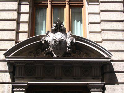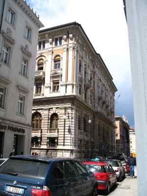 ISCRIZIONE (esterno) Sul parapetto del balcone del secondo piano della facciata principale è collocata l'iscrizione "CASSA DI RISPARMIO TRIESTINA" STEMMA (esterno) Sopra il portale d'ingresso stemma ovale con ape a rilievo e il motto "Lavora Raccogli Aumenta". ELEMENTI ORNAMENTALI (esterno) Riquadri decorativi con motivi geometrici e a nastri in corrispondenza delle specchiature tra i fori dell'ultimo piano. Motivi decorativi a greca alla base dei balconcini del primo piano. MENSOLE (esterno) Mensole a voluta in pietra bianca con testa d'uomo al quarto piano, con zampe e testa leonina al primo piano. Mensole a voluta in pietra bianca con motivo vegetale a sostegno dello sporto di linda e dei balconcini dei piani superiori. PANDURI (esterno) Mascheroni raffiguranti volto umano in chiave di volta in corrispondenza di alcune aperture del primo piano. LESENE (esterno) Lesene scanalate, rifinite a intonaco, con capitello corinzio a livello del secondo e terzo piano. SEMICOLONNE (esterno) Semicolonne scanalate, rifinite a intonaco, con capitello corinzio a livello del secondo e terzo piano del riquadro centrale della facciata principale. BALAUSTRE (esterno) Tutti i balconi sono ornati da balaustre in pietra con balaustrini ad anfora e pilastri angolari.