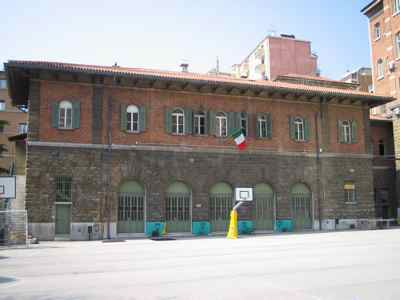 FABBRICATO PRINCIPALE Basamento in pietra bianca bulinata. Fascia superiore in bugnato a conci di pietra arenaria. Un marcapiano modanato in pietra bianca, che sovrasta un fregio continuo dentellato, segna la divisione dal resto della facciata. Essa è interamente rivestita in mattoni faccia a vista con alcuni elementi in pietra bianca a marcare le paraste. Elementi in pietra bianca inseriti anche tra gli archi ribassati dei fori dell'ultimo piano. Facciata su Via Ressel cieca. Parapetti delle due terrazze su Via Combi in pietra bianca. Banchina in pietra retta da coppie di reggimensole lavorate a volute, emergenti da un doppio fregio continuo dentellato. Bocche di lupo con inferriate nel basamento. Primi due livelli con fori arcuati a tutto sesto con serramenti in legno verniciato color bianco a nove o undici specchiature. Al primo livello due fori di dimensioni più ridotte a lato del portone sul cortile e nei volumi laterali: serramenti sempre lignei verniciati color bianco a cinque o tre specchiature. Al secondo livello di Via Combi doppi serramenti nel corpo centrale. Nel corpo laterale destro due bifore con serramenti in legno a tre specchiature. I restanti tre livelli hanno fori ad arco ribassato con davanzale e chiave di volte in pietra bianca; doppi serramenti in legno verniciato color bianco a undici specchiature. Nei corpi laterali che si affacciano sul cortile trifore e quadriforme con serramenti in legno a tre specchiature. Nel corpo laterale sinistro fori arcuati a tutto sesto o ad arco ribassato con serramenti lignei a tre specchiature. Portoni d'ingresso lignei a due battenti ciascuno e sopraluce. I fori arcuati sono tutti con cornice in pietra bianca modanata e pensilina sovrastante in legno che poggia su due reggimensole a volute in pietra bianca (IMG_1019). Gronda e pluviali esterni in lamiera. Doppio accesso su Via Combi. Corridoi pavimentati alla veneziana; aule con pavimenti in listelli di legno oppure con linoleum e controsoffitti in doghe d'alluminio. Corridoi occasionalmente inframmezzati da pareti lignee (IMG_1049). Scale nei corpi laterali. Sono di tipo appoggiato con trave d'acciaio di sostegno. Gradini in pietra bianca bulinata. Parapetto in ferro verniciato color bianco con passamano in legno (IMG_1046). RICREATORIO Basamento in pietra bianca bulinata. Fascia superiore in bugnato a conci di pietra arenaria. Rimanente parte di facciata rivestita in mattoni faccia a vista con conci di pietra arenaria a marcare gli spigoli del fabbricato. Scala laterale di accesso diretto al primo livello in pietra bianca bulinata con parapetto interamente in ferro. Facciata su Via Ressel cieca con solo sei piccoli fori rettangolari di recente fattura con serramenti in alluminio a unica specchiatura. Primo livello con fori arcuati a tutto sesto con serramenti in ferro verniciato color verde e sopraluce; inoltre fori rettangolari con serramenti in legno verniciato color verde a due specchiature con inferriate verniciate color verde. Una porta in ferro permette l'accesso al primo livello. Fori arcuati a tutto sesto nella struttura della scala con serramenti in legno a quattro specchiature o tamponati da assi di legno. Nel raccordo di collegamento con l'edificio principale fori rettangolari tamponati da tavolati dipinti. Secondo livello con fori arcuati a tutto sesto con davanzale in pietra bianca. Doppi serramenti in legno color bianco a quattro specchiature e sopraluce, la maggior parte dei quali provvista di oscuranti in legno verniciati color verde. Scala interna rivestita di linoleum antiscivolo con parapetto in ferro color verde. Corridoi, stanze e aule gioco pavimentate con quadrettoni di linoleum; controsoffitti costituiti da pannelli di fibre minerali. Palestra del livello inferiore con superficie in parquet.