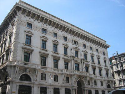 Il palazzo viene realizzato tra il 1909 ed il 1914 per ospitare la sede della Riunione Adriatica di Sicurtà su progetto degli architetti Ruggero ed Arduino Berlam. I problemi relativi all'ideazione dell'edificio sono abbastanza complessi: dalla scelta del terreno per la nuova sede, all'idea di bandire un concorso per il progetto fino alla realizzazione. Nel 1902 Adolfo de Frigyessy, direttore della Compagnia dal 1899, decide acquistare un'area centrale della città tra via Dante Alighieri, Santa Caterina, Corso Italia e piazza Nuova, oggi piazza della Repubblica. Sette anni dopo la società bandisce un concorso ad inviti per il progetto dell'edificio al quale partecipano dieci concorrenti; Ruggero ed Arduino Berlam si aggiudicano l'incarico con un disegno scenografico e monumentale arricchito da sculture e oggetti di design per l'allestimento interno. L'edificio viene arretrato di alcuni metri rispetto alle vecchie costruzioni permettendo una maggiore possibilità di lettura della struttura. Attualmente l'edificio ospita al pianterreno attività commerciali e uffici ai piani superiori.