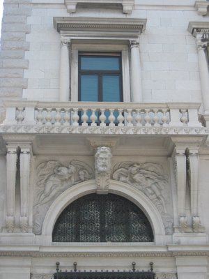 ELEMENTI ORNAMENTALI (esterno): Elementi decorativi a motivi floreali in pietra a rilievo in corrispondenza delle specchiature tra i fori architettonici all'ultimo piano e dello sporto di linda. ELEMENTI ORNAMENTALI (esterno): Chiave di volta a decorazione degli archi a tutto sesto, raffigurante volto di uomo scolpito in pietra. MENSOLE (esterno): Mensole a voluta in pietra a sostegno dei balconi e dello sporto di linda. BALAUSTRE (esterno): Parapetto dei balconi in pietra con balaustrini ad anfora. STATUE (esterno): Statue poste in corrispondenza dell'ammezzato nelle lunette della facciata principale raffiguranti le personificazioni di Fuoco e Aria, Pensiero e Azione, Acqua e Terra, eseguite dallo scultore Giovanni Mayer. STATUE (esterno): Statue poste in corrispondenza del secondo piano della facciata principale raffiguranti le personificazioni della Previdenza e della Protezione, eseguite dallo scultore Gianni Marin.