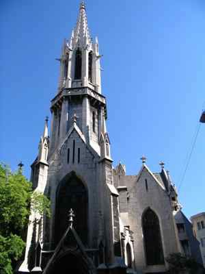 La chiesa, al centro di una piazza chiusa da alti palazzi, si presenta nelle forme agili e frastagliate del gotico tedesco. Esternamente è caratterizzata da contrafforti scalari, archi acuti, guglie e pinnacoli. L'abside è poligonale. Al centro della facciata principale, sopra al portale gotico, s'innalza un alta torre campanaria. L'interno, diviso in tre navate da quattro colonne, riceve luce dalle alte finestre ogivali con intrecci a traforo che si aprono sulle tre campate delle navate, sulla facciata e sull'abside.