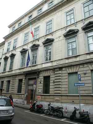Lungo le vie pubbliche, abbassamento in pietra bianca bulinata posto a correre lungo l'intera facciata, basamento in finto bugnato ad intonaco in corrispondenza del piano terra, con paraste poste a suddividere la facciata principale in tre porzioni ed a rafforzare gli spigoli dell'edificio; porzione superiore di facciata trattata ad intonaco liscio. Serramenti vetrati in legno massello a doppia anta verniciati colore verde con sopraluce e fascia vetrata inferiore apribile a vasistas. Al piano terra fori architettonici rettangolari, con piattabanda in finti conci trattati ad intonaco e davanzale in pietra bianca posto a correre lungo l'intera facciata; oscuranti esterni in doghe di legno massello verniciate colore verde; portale di accesso centrale in legno massello verniciato colore marrone, con anta centrale vetrata con inferriata in ferro battuto, specchiature laterali e superiori in legno massello; ai lati del portale, due fori finestra protetti da inferriate in ferro battuto danno luce all'ampio atrio; un portone in legno massello con sopraluce vetrato protetto da inferriata in ferro battuto dà accesso alla basilica paleocristiana. Al primo piano fori architettonici rettangolari incorniciati da edicole modanate in pietra bianca, timpani triangolari in corrispondenza della porzione centrale della facciata principale, architravi orizzontali modanati in corrispondenza degli altri fori. Fascia marcapiano a livello del davanzale delle finestre del secondo piano, incorniciate da elementi modanati in pietra bianca, con mensole a voluta a sostegno del davanzale. Coronamento a livello della linea di gronda, con fregio decorato da motivi geometrici e modanatura a dentelli posta a correre lungo il filo della banchina. Finestre dell'attico incorniciate da elementi modanati con concio di chiave in pietra bianca. Gronda e pluviale in lamiera, interni alla muratura a livello del piano terra in corrispondenza delle facciate lungo la pubblica via, banchina trattata ad intonaco e manto di copertura in coppi curvi rossi uso Trieste. Facciata rivolta verso il cortile interno trattata semplicemente ad intonaco, con fori finestra incorniciati da elementi semplici in pietra e protetti da inferriate in ferro battuto in corrispondenza del livello rialzato del cortile. Atrio di ingresso monumentale pavimentato in marmo, colonnato di separazione dal vano scala con colonne doriche in pietra di Aurisina bulinata, superfici verticali in spatolato colore beige. Scala del tipo appoggiato su putrelle metalliche con gradini in pietra bianca bulinata, pianerottoli sostenuti a mezzo di volte ribassate in pietra, balaustra in ferro battuto con corrimano ligneo; corridoi al primo ed al terzo piano pavimentati in battuto di cemento e graniglia; al secondo piano in parquet disposto a spina di pesce. Abbassamento laterale in pittura ad olio. Pavimenti delle aule in parquet ligneo disposto a spina di pesce. Serramenti interni in legno massello verniciato bianco, vetrati con specchiature di grandi dimensioni in corrispondenza delle porte di comunicazione tra i corridoi. Abbaini vetrati danno luce al sottotetto sul lato cortile.