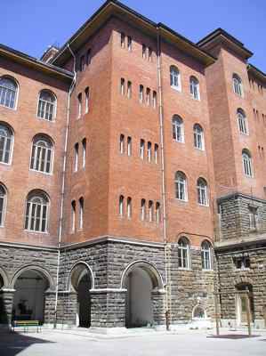 La superficie della facciata, al piano interrato e al primo piano, è costituita da una fascia in lastre di pietra bianca poste al piede del muro e, superiormente, trattata con un rivestimento in conci di pietra squadrata bugnata, disposti ad orizzontamenti regolari. Questa porzione di muro è delimitata da un marcapiano in pietra artificiale con profilo modanato il quale funge da davanzale alle finestre del secondo piano e divide la superficie bugnata da quella a mattoni a faccia vista dei piani superiori. Dal marcapiano, inoltre, si dipartono le lesene in mattoni di laterizio, integrate con blocchi squadrati lisci di pietra bianca. Le lesene coprono tutta l'altezza della facciata e sono, inoltre, integrate con parte della decorazione in pietra del marcapiano: sulla cima di ogni lesena, sono inserite due doppie mensole in pietra bianca, decorate a foglia d'acanto, poste sotto la cornice del tetto. Gli ingressi sono costituiti da portali ad arco a tutto sesto, in blocchi di pietra squadrata bugnata, contornati da una cornice modanata in pietra bianca e decorata con specchiature sull'intradosso dell'arco e lungo gli stipiti del portale. L'infisso ligneo del portale è a quattro battenti, con telaio chiodato e pannelli incassati a bugne diamantate, sulla parte inferiore dell'infisso. Le specchiature sono in vetro protette da grata in ferro battuto a motivi circolari; il telaio del sopraluce è in legno con singola specchiatura in vetro ad apertura a vasistas. Il portale dell'accesso carrabile di Via Manna è privo di pensilina, ma presenta le stesse decorazioni in pietra degl'altri portali sugli stipiti e sul contorno dell'arco: l'infisso è in legno a due ante, con specchiature quadrettate in legno, chiodature sui montanti e i traversi, sopraluce ad un'unica specchiatura in vetro con infisso a vasistas. Lateralmente all'imposta dell'arco del portale, sono inserite due mensole in pietra, con profilo modanato e superficie liscia, sulle quali sono posizionate tre mensole lignee soprapposte e trattenute da staffe metalliche. Su questi appoggi è sistemata l'orditura lignea dello spiovente, costituita da due travi lignee, appoggiate su dormienti e collegate da staffe metalliche inchiodate, e dall'orditura dei travicelli, coperta da una piastra di lamiera zincata foderata. I fori del piano interrato sono con piattabanda e, ai fianchi del portale d'ingresso, ad arco: entrambe sono realizzate in conci di pietra bugnata, prive di cornice e con infisso a doppia camera, a due battenti in legno verniciato a doppia anta con specchiature in vetro e grata in ferro battuto verniciato. I fori del primo piano sono con architrave a piattabanda, in conci di pietra squadrata bugnata, riquadrate dal bugnato della facciata; l'infisso è in legno verniciato a doppia camera, a due ante incernierate a spallette mobili, a doppia specchiature in vetro e sopraluce a vasistas tripartito da specchiature in vetro. In corrispondenza dei portali, anche in questo piano, le finestre sono ad arco con conci di pietra squadrata bugnata: l'infisso è in legno verniciato a due ante con quattro specchiature e sopraluce ad un'unica specchiatura. I fori dei piani superiori sono a piattabanda, al secondo piano, e ad arco ribassato, al terzo e quarto piano: entrambe sono realizzate in mattoni rossi di laterizio, con concio di chiave in pietra bianca, e riquadrate da una cornice lisca in pietra artificiale. Gli infissi sono in legno verniciato a doppia camera, a due ante incernierate a spallette mobili, a doppia specchiature in vetro e sopraluce a vasistas tripartito da specchiature in vetro. Le doppie finestre, al quarto piano nel corpo centrale di Via Sant'Anastasio, sono realizzate da stipiti in mattoni a faccia vista, cinti da una cornice in pietra modanata e alloggiata in prossimità dell'imposta dell'arco: le due finestre sono separate da una colonnetta, in pietra bianca liscia con basamento e capitello ellenico, su cui poggia l'attaccatura dei due blocchi di pietra bianca che costituiscono l'arco. L'infisso è in legno verniciato a doppia camera, a due battenti con doppia specchiatura in vetro e sopraluce vetrato. Il portico, confinante con un lato del cortile, è costituito da archi a tutto sesto poggiati su pilastri quadrangolari. L'intradosso degli archi sono rivestiti con cornice, modanata in pietra bianca, e decorata da specchiature lisce: all'altezza dell'imposta dell'arco, si sviluppa una cornice modanata, in pietra bianca, inserita sulla superficie bugnata della facciata. La copertura del portico è a volta lunettata rivestita da intonaco bianco. Il prospetto della palestra, all'interno del cortile, è forato da bucature ad arco ribassato, in conci di pietra squadrata bugnata, riquadrate da un telaio in pietra artificiale e da una coppia di scalini in pietra bianca lisciata: l'infisso dei portoni è in legno verniciato a due ante con due specchiature vetrate e grata in ferro battuto; il sopraluce è ad unica specchiatura in vetro protetta da listelli in ferro saldato. Sull'estradosso dell'arco, si trovano i fori di doppie finestre, incassate sotto il filo della piattabanda in pietra bugnata, e riquadrate da un telaio in pietra bianca: il telaio è composto da tre pilastri quadrangolari, con basamento e capitello, poggiati su una lastra in pietra e sovrastati da architrave. L'infisso è a vasistas in legno verniciato con specchiatura in vetro e grata in ferro battuto. La sommità del muro della palestra è decorata da una cornice in pietra bianca modanata e chiusa da una ringhiera in ferro battuto. A lato della palestra, si trova un fontana semicircolare con vasca in pietra bianca decorata. L'atrio d'ingresso è fiancheggiato da due piccole navate costituite da tre archi in muratura impostati su pilastri quadrangolari in marmo: ai lati, incassati nel muro, sono collocate delle panchine in pietra levigata. All'interno di una navata è posizionata una statua classica in pietra bianca. La pavimentazione è in piastrelle di 