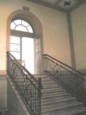 LESENE (Esterno): Lesene realizzate in mattoni di laterizio e blocchi squadrati lisci di pietra bianca; la parte sommatale, è integrata da due doppie mensole in pietra bianca, decorate a foglia d'acanto, poste sotto la cornice del tetto. MENSOLE (Esterno): Mensole in pietra bianca decorata a foglia d'acanto e volute. STEMMA (Esterno): Stemmi rettangolari in pietra bianca, raffiguranti un'alabarda, inseriti nel bugnato della facciata di Via Commerciale e di Via Manna. MARCAPIANO (Esterno): Cornice marcapiano, posta tra il terzo e quarto piano, in pietra bianca con gocciolatoio a dentelli, modanata da fasce lisce e listelli. CORNICE (Esterno): Cornice neoclassica composta da lastre in pietra bianca e decorata con modanature a fascia e ad ovuli. FONTANA (Interno- cortile): Fontana in pietra bianca collocata in cortile e interclusa nel bugnato del piano terra: la struttura è composta da un arco a tutto sesto, in conci squadrati e bugnati con concio di chiave raffigurante un panduro, rivestito sull'estradosso da una cornice in pietra bianca modanata e, sullo sfondo, da una specchiatura semicircolare. Il fronte della vasca è di forma semicircolare convessa, sporgente dal filo del muro, e decorato da pannelli in pietra. STEMMI (Interno- cortile): Cinque stemmi in pietra bianca, inseriti nella superficie bugnata del prospetto della palestra, collocati tra le doppie finestre e costituiti da pannelli lapidei raffiguranti simboli ludici. STEMMI (Interno- cortile): Quattro stemmi in pietra posti sotto la prima cornice marcapiano del portico e in asse con l'imposta degli archi: sono costituiti da un unico pannello con cornice nel quale sono raffiguranti strumenti utilizzati per lo studio della musica, della geografia, del disegno e degli scritti. FONTANE (Interno): Fontane in marmo di Aurisina, disposte lungo la parete del corridoio e costituite da una pannello in pietra, fissato al muro, e da una vasca monolitica sorretta da piedritti modanati di stessa natura. MENSOLE (Interno): Mensole in pietra modanate con volute e foglie d'acanto, inserite nel muro del corridoio del primo piano ed utilizzate ad uso ornamentale. BUSTO (Interno): Busto in bronzo raffigurante Guido Corsi, collocato nell'atrio dell'ingresso principale, con lapide commemorativa in marmo. STATUA (Interno): Statua in pietra bianca con basamento in marmo, sistemata nella navata laterale dell'atrio d'ingresso e raffigurante una figura in stile classico.