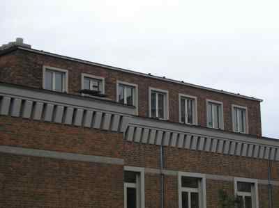 CORNICE: cornice del tetto composta da una serie di grossi dentelli a forma di cuneo in pietra massiccia, cinti superiormente da una sopracornice in lastre di pietra lisca. MARCAPIANO: in pietra artificiale posta a filo della muratura con blocchi sagomati per l'inserimento del pluviale.