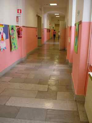 La superficie esterna del piano interrato è rivestita con intonaco cementizio trattato a finto bugnato. Il rivestimento è delimitato, al piede del muro, da una fascia in lastre di pietra artificiale, e superiormente da una cornice marcapiano modanata, anch'essa in malta cementizia, tinteggiata di colore bianco. Il paramento del primo piano è rivestito da intonaco tinteggiato color mattone, decorato da finte fughe orizzontali. Una cornice modanata, in pietra bianca artificiale, è posta in corrispondenza dei davanzali dei fori al primo e secondo piano. Il rivestimento del primo piano è delimitato, superiormente, da un secondo marcapiano, in malta cementizia tinteggiata; la parte rimanente del rivestimento è in intonaco liscio tinteggiato color mattone. Il piano seminterrato presenta piccole finestre con grata in ferro saldato. Gli infissi sono in alluminio verniciato di colore bianco, a due battenti con unica specchiatura al piano seminterrato e a due ante e sopraluce a vasistas, entrambe con un'unica specchiatura in vetro, ai piani superiori. I fori del primo piano sono riquadrati da cornice modanata in pietra artificiale. Le finestre del secondo piano sono riquadrate da cornice in pietra con, sotto il davanzale, due piccole mensole modanate a volute in pietra artificiale; sopra l'architrave si trova un fregio liscio, affiancato da due elementi in pietra artificiale, sagomati a punta di diamante. I portali d'ingresso sono riquadrati da stipiti in pietra artificiale modanata e dotati di soglia in pietra calcarea. Il portale è protetto da ampia pensilina in pietra artificiale, decorata nell'intradosso da specchiature e sorretta da due mensole sagomate in pietra artificiale. La cornice della pensilina è sagomata con motivi neoclassici con gocciolatoio e palmette in pietra sugli spigoli. Il sopraluce del portale, definito da cornice in pietra artificiale modanata, presenta un infisso ligneo a due ante. Il portone, in legno verniciato, è composto da due battenti laterali e portoncino d'entrata, entrambi forati da strette specchiature in vetro protette con grata in ferro battuto verniciato. Sull'architrave ligneo dei portali si trovano due iscrizioni in ottone su cui è riportata la dicitura Sezione Femminile e Sezione Maschile. Si raggiunge l'atrio, con pavimentazione in piastrelle di graniglia policroma. percorrendo una scala ad unica rampa, con scalini in pietra e spallette in muratura e ringhiera in ferro battuto. La pavimentazione del piano interrato è in massetto cementizio. Il controsoffitto del solaio è in incannucciato rivestito da malta cementizia tinteggiata. La distribuzione dei piani superiori è organizzata attorno al corridoio su cui si aprono le aule e gli affacci al cortile interno. La pavimentazione del corridoio è in lastre in pietra levigata alternate da superfici riquadrate in battuto di graniglia. La pavimentazione delle aule è in parquet. La pavimentazione dei vani di servizio è in piastrelle di ceramica. Le porte delle aule sono in legno verniciato con sopraluce a doppia specchiatura in vetro. Le due scale principali sono a rampa con interpiano, realizzate con scalini in pietra sagomata e integrati con una putrella metallica, posta sull'intradosso della rampa. La pavimentazione dell'interpiano è in battuto di graniglia policroma. La ringhiera è in ferro battuto verniciato con corrimano in legno. La copertura è costituita da una struttura portante in capriate lignee. Sull'orditura secondaria in travicelli è disposto il letto di pianelle in laterizio e il manto di coppi.