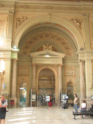 Nel 1850 vennero avviati i lavori di costruzione della prima stazione ferroviaria di Trieste; la prima linea aperta in città permetteva il collegamento con Vienna, al quale si aggiunse nel 1857 la linea Trieste Lubiana. Per la costruzione della prima stazione, che si trovava un centinaio di metri arretrata rispetto alla struttura attuale, fu scavata parte della collina di Scorcola e vennero demoliti diversi edifici. Poco tempo dopo si rivelò la necessità di ingrandire la stazione e di costruire un nuovo edificio per accogliere i passeggeri. Nel 1869 il Lazzaretto S. Teresa fu demolito e nel 1873 si iniziarono i lavori per l'ampliamento della stazione. La nuova stazione, costruita su progetto dell'architetto Wilhelm Flattich di Stoccarda, fu inaugurata il 19 giugno 1878 e completata nel 1888. Il complesso della stazione era costituito anche da altri due edifici; la cosiddetta "Casa del ferroviere" e la rimessa semicircolare, demoliti negli anni Settanta. Diverse modifiche interessarono la struttura nel corso del XX secolo, tra la creazione di nuovi locali per ospitare servizi e uffici. Attualmente parte dell'edificio è in restauro.