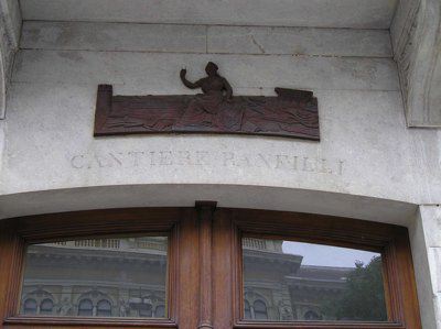 ISCRIZIONE (esterno) Sopra i portali iscrizioni scolpite nella pietra. Da una parte si può leggere "CANTIERE PANFILLI", dall'altra "ANNO MDCCCXXXXIII". ELEMENTI ORNAMENTALI (esterno) Targa in metallo a bassorilievo raffigurante una figura femminile con sullo sfondo una nave in costruzione.