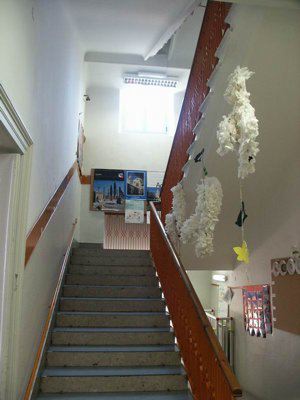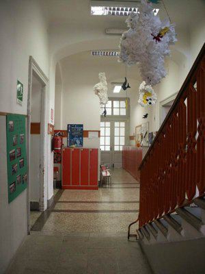 Serramenti esterni in alluminio verniciato bianco a due ante con sopraluce vetrato. Abbassamento in pietra bianca bocciardata a correre lungo tutto il perimetro dell'edificio; superficie di facciata trattata a finto bugnato ad intonaco in corrispondenza del piano terra; marcapiano modanato in pietra bianca a correre lungo l'intero perimetro dell'edificio. Sul prospetto rivolto verso il cortile interno, due fori architettonici risultano tamponati in muratura rifinita ad intonaco. Scala esterna di accesso al cortile in pietra bianca bocciardata. Banchina trattata ad intonaco, gronda e pluviale in lamiera. Copertura a padiglione con manto in coppi curvi rossi uso Trieste. Serramenti interni originali in legno massello verniciato colore grigio in corrispondenze delle aule; pavimento in linoleum nell'atrio di ingresso, in battuto di cemento e graniglia nei corridoi al piano terra, in parquet ligneo nelle aule; scala in pietra bianca bocciardata, rivestita in lineoleum, balaustra in ferro verniciato decorata da motivi geometrici e corrimano ligneo; corridoio al primo piano pavimentato in linoleum. Superfici murarie intonacate colore bianco e controsoffitto a sospensione con correnti in alluminio e pannelli alleggeriti.