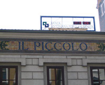 La struttura presenta pianta rettangolare e due piani fuori terra. Affaccio principale su Piazza Carlo Goldoni e secondario su Via Silvio Pellico. La facciata principale presenta fori commerciali al pianterreno, caratterizzato da rivestimento in pietra grigia; al centro si apre un portale ad arco a tutto sesto, con mensola in chiave di volta, affiancato da semicolonne lisce e semipilastri a fasce con capitello corinzio, a sostegno del balcone con parapetto in ferro battuto del secondo piano. Il piano superiore, trattato ad intonaco giallo, è caratterizzato da una serie di diciannove fori finestra, con cimasa lineare in pietra bianca e cornice marcapiano a sostegno dei davanzali. In corrispondenza della parte centrale della facciata si trova una sopraelevazione, coronata da timpano, su cui si aprono tre fori finestra. Il prospetto su Via Silvio Pellico presenta pianterreno con rivestimento a bugnato rustico e cinque archi a tutto sesto, e piano superiore a bugnato liscio e cinque fori finestra con cornice. A coronamento della facciata si trova un fregio decorato da motivi vegetali e al centro la scritta "Il Piccolo".