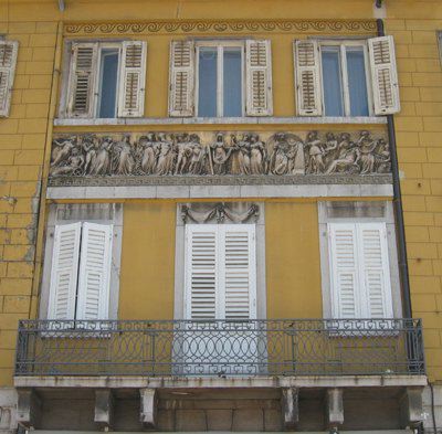 LUNETTE (esterno): Decorazioni a bassorilievo raffiguranti figure allegoriche in corrispondenza delle lunette del piano nobile. FREGIO (.esterno): Pannello a bassorilievo raffigurante una scena classica, attribuito allo scultore Antonio Bosa, inserito al di sopra delle finestre centrali del piano nobile.