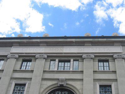 ISCRIZIONE (esterno) Nella parte alta della facciata è presente la scritta CIVICO MONTE DI PIETA' scolpita nella pietra. LESENE (esterno) La parte centrale della facciata è scandita da quattro lesene ioniche di ordine gigante.
