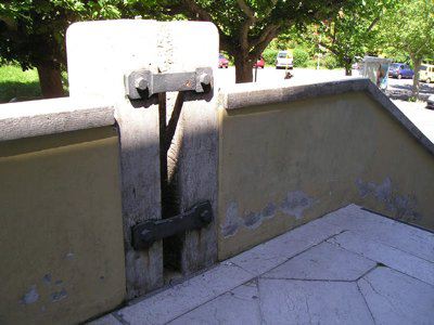 STELE (esterno): pilastro in pietra massiccia, inserito nel parapetto della scala e decorato con un'alabarda scolpita; sul retro è previsto l'alloggiamento dell'asta di una bandiera con due staffe in metallo (P1010030.JPG). OROLOGIO (esterno): orologio posizionato sul timpano in muratura del prospetto principale. MARCAPIANO (esterno): marcapiano in pietra artificiale, a profilo rettangolare, disposto sul limite superiore del rivestimento del piano interrato. CORNICE (esterno): cornice del tetto, a profilo rettangolare con gocciolatoio, in pietra artificiale.