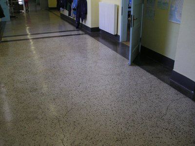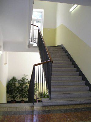 La base dei muri perimetrali è rivestita con una fascia in lastre di pietra bugnata; al di sopra e fino all'altezza del primo marcapiano, la superficie muraria è rivestita da intonaco cementizio, decorato a finto bugnato. La rimanente superficie esterna è rivestita da intonaco di colore giallo chiaro. La scalinata, collocata al centro del prospetto principale, è composta da quattro rampe di scale, a due a due simmetriche. I setti murari della scala sono rivestiti da lastre in pietra bugnata e sono forati da finestre rettangolari con infisso in alluminio ed inferriata metallica. Il pilastro in pietra inserito nel parapetto è decorato sulla parte superiore esterna con un'alabarda scolpita; nella parte retrostante è predisposto con due staffe metalliche il posizionamento di una bandiera (P1010030.JPG). Le rampe di accesso conducono ad un vestibolo, costituito da pilastri a base quadrata in calcestruzzo armato e copertura piana; la pavimentazione è in latre di pietra bianca levigata (P1010015.JPG). I fori finestra, con cornici in pietra artificiale e davanzale in pietra levigata, sono ad arco a tutto sesto lungo il piano seminterrato, rettangolari ai piani superiori. Gli infissi sono in alluminio colorato (rosso). I portoni d'ingresso sono incorniciati da piedritti ed architrave in pietra artificiale; l'infisso è in legno a due ante, dotato di portello secondario e specchiature in vetro con inferriata composta da elementi verticali. L'atrio d'ingresso conduce ad una scala con gradini in pietra; la pavimentazione dell'atrio e dell'androne è in piastrelle policrome di conglomerato levigato: la pavimentazione dei corridoi ad ogni piano è costituita da un battuto in cemento; quella delle aule e della palestra è in parquet ligneo. I locali servizio sono rivestiti con piastrelle in gres. Le rampe scala, appoggiate su profili metallici, sono in pietra; la ringhiera è in ferro saldato con corrimano in legno. Su un fianco dell'edificio, si trova il vano ascensore ed una scala di servizio in cemento armato; gli scalini sono rivestiti da lastre in pietra levigata e la ringhiera è in ferro saldato con corrimano in legno.