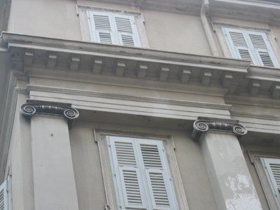 COLONNE E PILASTRI (esterno): Struttura costituita da sei semicolonne ioniche e tre semipilastri di ordine gigante su alto basamento in corrispondenza del primo e del secondo piano del prospetto principale. BALCONE (esterno): Balcone con balaustra in pietra in corrispondenza dell'angolo sinistro al primo piano del prospetto principale. CORNICE (esterno): Cornice a dentelli a decorazione della trabeazione del prospetto principale.