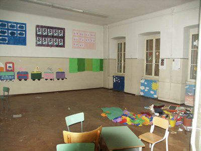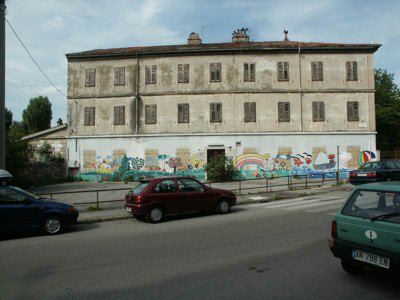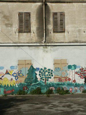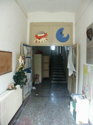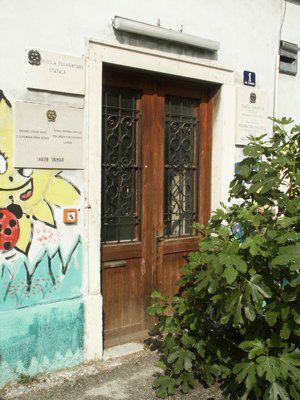 GRAFITI (esterno) Graffiti murali in corrispondenza della fascia basamentale della facciata principale, presumibilmente eseguiti dagli alunni che un tempo frequentavano la scuola; vi sono raffigurati bambini, alberi, animali, funghi ed altri elementi naturali. LAPIDE(interno) Lapide in pietra di Aurisina, riportante la dicitura "MARICA GREGORIC STEPANCIC, 1874-1954, UCITELJICA-PISATELJICA" e riportante la relativa raffigurazione del volto.