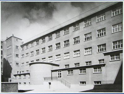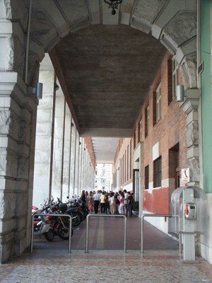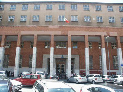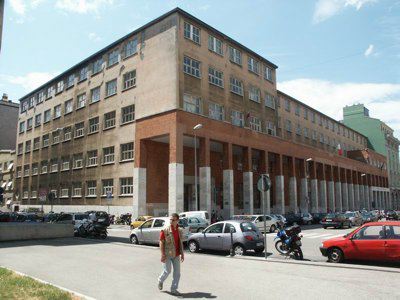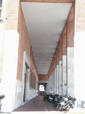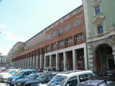 Fabbricato appartenente al comprensorio di Piazza Oberdan e Foro Ulpiano, progettato nel corso degli anni Trenta. Composizione stereometrica di due solidi parzialmente compenetrati e connotati da un ampio porticato posto in prospettiva del palazzo del tribunale. Suddivisione in tre parti del prospetto principale lungo la Via Giustiniano; una fascia basamentale rivestita in pietra bianca, una fascia centrale rivestita in laterizio, una fascia superiore arretrata rispetto al filo esterno del porticato trattata ad intonaco. Strutture portanti verticali e scale interne in calcestruzzo armato, solai di interpiano e di copertura in laterocemento; copertura piana.