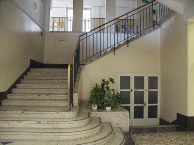 La creazione di un ginnasio comunale italiano risale al lontano 1862 allorquando il Consiglio comunale ne decretò l'istituzione in una sede nell'allora piazza della Dogana. Nel 1883 l'istituto si trasferì nell'edificio di largo Panfili, ma la sempre crescente richiesta di aule costrinse il Comune a trovare un'ubicazione più adeguata alle reali necessità: nel 1936, su progetto dell'arch. Vittorio Privileggi e con un costo complessivo di £ 3.100.000, venne così costruito in via Giustiniano (ex viale Regina Margherita) l'edificio in questione. Il fabbricato in stile "900" risulta essere un imponente costruzione di ben cinque piani con pianta ad "L", tetto piano ed un'ampia terrazza. Essendo già in corso di realizzazione la Casa centrale del Balilla, sul lato opposto della via, la nuova struttura scolastica vi si ricollegava idealmente per forma e per stile con lo scopo precipuo di sintetizzare i due edifici in un'unica armonia. La scuola venne quindi suddivisa in due parti distinte con tre ingressi: due laterali ed uno centrale, quest'ultimo conduceva in quello che veniva considerato l'atrio d'onore con il famedio degli ex alunni caduti in guerra. Sulla facciata, lineare nella sua sobria semplicità, spicca un importante porticato a doppia altezza con pilastri rivestiti in pietra d'Istria, elemento principale dell'intero progetto. Ai lati del fabbricato lungo il porticato furono posizionate quelle strutture che non necessitavano di una forte illuminazione naturale: la palestra e l'aula magna, mentre ai piani superiori trovarono posto ben 31 aule. Nel 1943 il piano terra dell'edificio fu occupato da truppe di soldati tedeschi che di lì a poco presero possesso di tutta la scuola. Sei anni più tardi l'amministrazione fu in grado di riappropriarsi del fabbricato che richiese però un immediato restauro portato a termine nel 1951 dal G.M.A con una spesa di ben sette milioni di lire. Nel 1954 l'edificio fu ulteriormente sopraelevato di un piano per ospitare gli alunni della scuola media. Nel 1960 la costruzione venne ampliata di una seconda palestra.