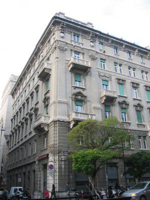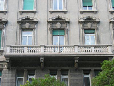 BALCONI (esterno): Balconi con balaustra in pietra in corrispondenza della sezione centrale del terzo piano, ai lati del quarto e quinto piano e a coronamento dei corpi aggettanti alle estremità della facciata principale. LESENE (esterno): Lesene di ordine gigante su alti piedistalli, scanalate nella parte superiore e arricchite da capitello corinzio in corrispondenza dei corpi aggettanti alle estremità di tutti e tre i prospetti. SEMIPILASTRI (esterno): Semipilastri con capitello corinzio in corrispondenza delle finestre tripartite poste alle estremità delle facciate e delle finestre bipartite del quinto piano. CORNICE (esterno): Cornice a dentelli lungo tutto il perimetro dell'edificio al di sopra del quinto e del sesto piano. ELEMENTI DECORATIVI (esterno): Rilievi in pietra raffiguranti motivi floreali, ghirlande, medaglioni e mensole a voluta a decorazione della superficie muraria dei tre prospetti dell'edificio. ELEMENTI DECORATIVI (interno): Decorazioni in stucco dorato, rilievi stile Liberty e affreschi caratterizzano le sale del Caffè San Marco al pianoterra dell'edificio.