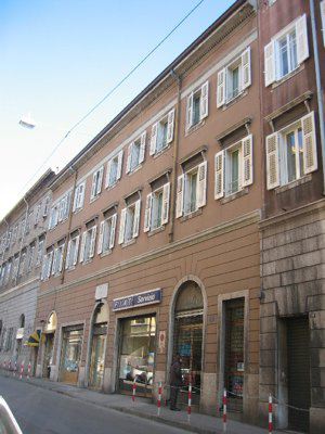 L'edificio venne realizzato nel 1851 su progetto dell'architetto Giovanni Degasperi; il disegno originale prevedeva un unico complesso per le case segnate con i numeri 23 e 25 di via Udine, le quali si presentano simili per composizione ma su diversi livelli. La struttura è caratterizzata al pianterreno da bugnato, delimitato da marcapiano, con tre archi a tutto sesto alternati a finestre. Le aperture del primo piano presentano cornici con eleganti mensole. A coronamento del prospetto si trova un cornicione ornato da modanature a dentelli. Sulla facciata spicca una lapide caratterizzata dalla seguente iscrizione: "Visse in questa casa dal 24 agosto 1869 al 16 luglio 1878 Guglielmo Oberdan fanciullo e giovinetto in sé con ardente fremito temprando la italiana volontà del domani. Auspice la Società Nazionale per la Storia del Risorgimento MCMXXXIV E-F-XII". L'edificio è vincolato limitatamente alla facciata principale.
