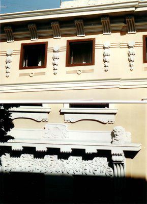 ELEMENTI ORNAMENTALI (esterno) Motivi decorativi di stile liberty con elementi geometrici e floreali ornano le aperture delle finestre e il portale d'ingresso. Fregi con decorazioni geometriche riempiono gli spazi tra le aperture degli ultimi due livelli. ISCRIZIONE (esterno) Sull'architrave del portale d'ingresso è scolpita la data in caratteri romani "MCMV", che corrisponde all'anno di costruzione dell'immobile.