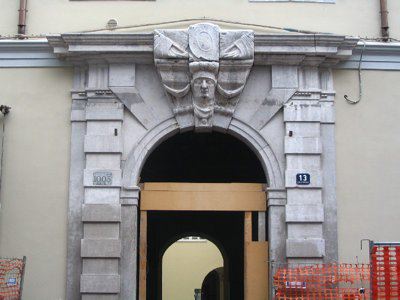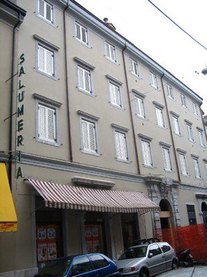 MASCHERONE (esterno) Panduro in pietra raffigurante una testa d'uomo in chiave di volta del portale. Il panduro è sormontato da uno stemma ovale e trofei militari. LAPIDE (esterno) Lapide recante l'iscrizione "Il 17 marzo 1803 nacque in questa casa Luigi de Jenner emerito ricercatore e conservatore di patrie memorie lasciò contributi preziosi alla storiografia locale". La lapide fu apposta dal Comune di Trieste il 28 marzo 1950.