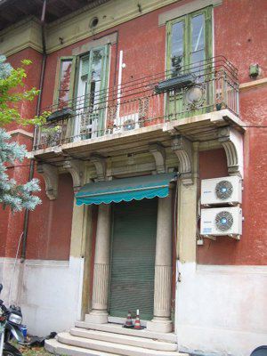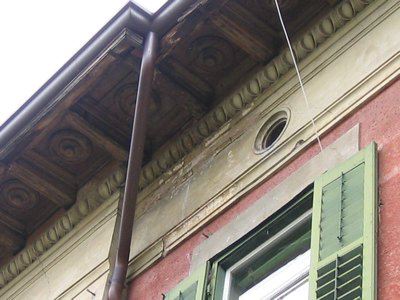 CANCELLO IN FERRO BATTUTO (esterno): Cancello d'ingresso in ferro battuto verniciato color grigio con decorazioni a volute e montante superiore recante l'effige dell'alabarda. (IMG_1325) TETTOIA IN FERRO BATTUTO (esterno): Tettoia a copertura del portone d'ingresso principale in ferro battuto retta da due staffe a voluta recanti motivi floreali. (IMG_1352) LAPIDE (esterno): Lapide in marmo recante la probabile data di edificazione: A.D. MCMI. (IMG_1352) CORNICE DECORATIVA (esterno): Cornice decorativa del foro del vano scala in pietra bianca, elegantemente lavorata con volute. (IMG_1352) PARAPETTO IN FERRO BATTUTO (esterno): Parapetto dei poggioli in ferro battuto recante scudi tondeggianti e motivi vegetali. (IMG_1375) DECORAZIONE LIGNEA A CASSETTONI (esterno): Decorazione lignea a cassettoni nell'intradosso della linda; nei quadroni sono inserite figure circolari concentriche. (IMG_1373) PARAPETTO SCALA CENTRALE (interno): Parapetto della scala centrale in ferro battuto con decorazioni a volute. (IMG_1340)
