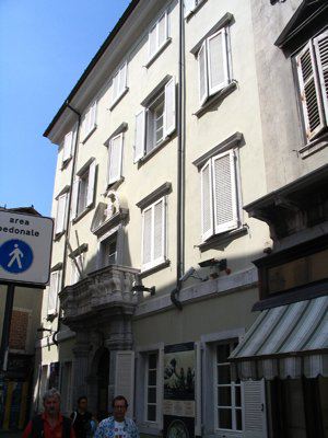 ELEMENTI ORNAMENTALI (esterno) Decorazioni a motivo floreale sono scolpite sull'architrave sorretto dai pilastri tuscanici e sulla cornice della portafinestra del primo piano. BALAUSTRA (esterno) La balaustra del poggiolo presenta colonnine ritorte in pietra. STEMMA (esterno) Stemma della famiglia Leo, raffigurante dentro uno scudo ovale inquartato due rose e bande orizzontali. Lo stemma è sormontato da una corona. MASCHERONE (esterno) Testa d'uomo con elmo in pietra collocato in chiave di volta del portale d'ingresso.