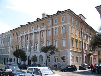 L'edificio, in stile neoclassico, è composto da pianoterra e tre piani superiori. Il prospetto principale, che si affaccia sulle rive, è caratterizzato da un corpo centrale in aggetto con una serie di arcate in bugnato liscio che sorreggono una balaustra in pietra, sulla quale si impostano sei semicolonne ioniche, comprendenti primo e secondo piano. Al di sopra del colonnato si imposta una balconata a colonnine in pietra. Le altre due facciate dell'edificio ripetono il motivo dell'ordine gigante del prospetto su riva Nazario Sauro, ma le semicolonne sono sostituite da lesene ioniche. La facciata su via dell'Annunziata è contraddistinta da un balcone centrale. Tutte le finestre del piano nobile sono architravate. Una cornice a dentelli conclude le facciate sotto lo sporto di linda, sostenuto da mensoline. Sul tetto, in posizione centrale rispetto alla facciata principale, si erge una torretta con cupola.