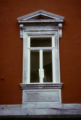ELEMENTI ORNAMENTALI (esterno) Decorazioni a cartelle appena in rilievo sono disposte sotto le finestre del primo piano e tra le aperture della falsa loggia centrale. LESENE (esterno) Lesene lisce di ordine gigante con capitello corinzio. MENSOLE (esterno) Mensole a voluta si alternano alle finestre nel mezzanino. In corrispondenza delle lesene centrali sono disposte a coppie. Quattro coppie di mensole a voluta vegetale, decorate con mascheroni raffiguranti teste leonine ed equine, sostengono la balconata del piano nobile. MASCHERONE (esterno) In chiave d'arco del portale d'ingresso è collocato un mascherone raffigurante una testa d'uomo con elmo e cimiero.