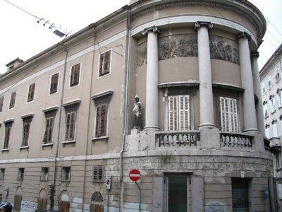 Pertsch si trovò ad operare in un lotto di terreno a cuneo altimetricamente malagevole nel tessuto urbano frammentario e irregolare della città medievale. Per prima cosa egli realizzò un piano orizzontale, costituito dal piano terra a bugnato, sul quale appoggiare la costruzione. Sull'angolo acuto del lotto, Pertsch progettò una facciata semicircolare con colonne ioniche di ordine gigante. Le colonne sono addossate al muro nel quale si aprono tre porte finestre con balaustra tra i basamenti delle colonne stesse e, nella parte superiore, dei bassorilievi. Nello spazio tra le colonne esterne e la muratura delle facciate laterali, sono collocate due statue raffiguranti Marte e Minerva. Il colonnato sostiene una cornice spessa fortemente aggettante che presenta decorazione a ovuli e una fascia a dentelli. All'interno dell'edificio, in corrispondenza della facciata convessa, si trova una sala circolare voltata a cupola con affreschi attribuiti a Giuseppe Gatteri, così come gli affreschi di ispirazione pompeiana che si trovano in una saletta attigua.