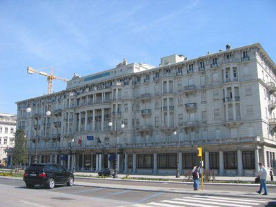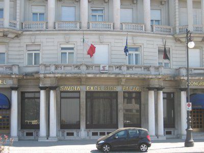 L'immobile sorge sul sito occupato fino agli inizi del Novecento dagli edifici della Sanità e del Governo Marittimo, trasferiti rispettivamente presso la Lanterna e nell'area di Sant'Andrea. Risale al 1841 il primitivo progetto di costruzione del teatro Ferdinandeo, poi non concretizzato, sull'area di Riva Mandracchio, creata dalle opere settecentesche di imbonimento del tratto di mare antistante. L'edificio in esame viene costruito tra il 1910 ed il 1912 su progetto, datato 6 luglio 1910, dell'architetto viennese Leopoldo Fiedler. La realizzazione del palazzo viene affidata alla Società di Costruzioni Union, seguita da Giuseppe Hinnel. Le fondamenta vengono gettate dall'impresa Ways Wastermann e Cie di Graz, utilizzando il sistema Zublin attraverso l'inserimento a pressione nel terreno di 800 pali in cemento armato. L'Hôtel Excelsior di proprietà della Prima Società Austriaca d'Alberghi è inaugurato il 22 giugno 1911, anche se non ancora ultimato. L'albergo viene completato con la collocazione alla sommità della facciata delle statue di Nettuno e della Città di Trieste, opera dello scultore Ambrogio Pirovano impiegato nella "fabbrica e vendita di pietra e marmi artificiali". Tra il 1915 ed il 1918 risalgono i progetti per la costruzione di due verande sulla facciata principale. Nel 1924 vengono apportate delle modifiche in facciata per garantire l'accesso al Caffè Savoia, affacciato su Via Mercato Vecchio. Negli anni Cinquanta vengono sistemati gli spazi destinati al Cinema Savoia e alla taverna su Via Luigi Cadorna. Diversi interventi interessano l'edificio tra gli anni Sessanta e Settanta, compresa la ristrutturazione generale degli impianti. Al pianoterra vengonon creata sale riunioni e nuovi ambienti come indicato dai progetti del 1990 e del 1993. L'albergo, dotato di 250 stanze e arredato con diversi stili, dal Luigi XIV all'americano moderno, ha ospitato la sede dell'alta ufficialità austriaca, e durante gli ultimi anni di guerra ospitò un comando truppa e un ospedale militare. Nel 1927 l'Hôtel assume il nome di Savoia e nel 1942 di Savoia Excelsior Palace. Nel 1949 sull'edificio vengono realizzati lavori di ripristino a causa dei danni provocati dalle cannonate sparate dalle navi tedesche del maggio 1945. Chiuso nel 1970 per ristrutturazione, l'albergo riapre nell'agosto del 1976. L'edificio ha ospitato fino al 2005 lo Starhotel Savoia Excelsior, albergo a quattro stelle, dotato di 155 camere, una trentina di appartamenti-residence e un ristorante al pianoterra. Attualmente l'albergo è chiuso per rinnovo.