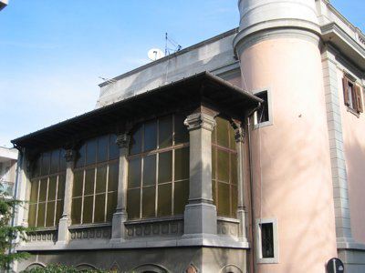 SERLIANA (esterno): Struttura a serliana costituita da balaustra in pietra aggettante nella parte centrale, caratterizzata da colonne libere ed ai lati semipilastri con capitello ionico. La chiave di volta dell'arco a tutto centro è arricchita da una mensola a voluta. La specchiatura superiore in pietra presenta una decorazione a motivi geometrici con parti in rilievo raffiguranti elementi floreali e due ghirlande simmetriche rispetto l'arco centrale. BALAUSTRA (esterno): Parapetto in pietra a balaustra in corrispondenza della terrazza superiore. VERANDA (esterno): Veranda con struttura di sostegno in pietra caratterizzata da pilastri con capitello ionico, copertura lignea in corrispondenza della terrazza del secondo livello della facciata posteriore. TORRETTA (esterno): Torretta circolare su cui si aprono due solo finestre e terminante con struttura a colonne libere di ordine ionico e copertura lignea. CANCELLO (esterno): Cancello in ferro battuto decorato da motivi geometrici e floreali.