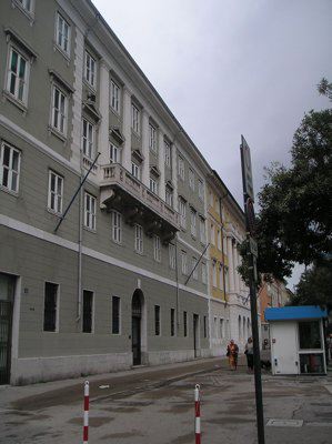 BALCONE (esterno): Balcone con balaustra in pietra in corrispondenza della parte centrale del terzo piano del prospetto su Riva Sauro. BALCONE (esterno): Parapetto in ferro battuto in corrispondenza della parte centrale del terzo piano dei prospetti su Via Venezian e Cadorna. LESENE (esterno) Lesene scanalate di ordine gigante in corripsondenza della superficie rientrante centrale del prospetto su Riva Sauro. RILIEVI (esterno): Rilievi raffiguranti crone di alloro a decorazione delle finestre del terzo piano. CORNICE (esterno): Cornice a dentelli a coronamento dell'edificio. CORNICE (esterno): Conci in bugnato liscio disposti a pettine a cornice della specchiatura rientrante del prospetto su Riva Sauro e a rinforzo degli angoli dell'edificio.