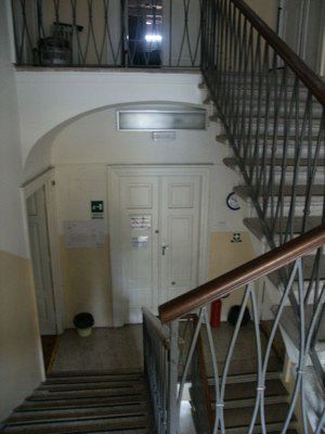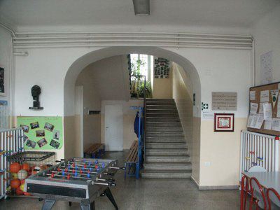 CORPO EDILIZIO PRINCIPALE Un abbassamento in intonaco grezzo protegge l'intonaco liscio di facciata dipinto in color rosso porpora. La facciata principale presenta al piano terra un finto bugnato liscio; paraste lisce rifinite ad intonaco suddividono la facciata in tre parti, mettendo in evidenza la porzione centrale, sovrastata dall'attico; un imponente marcapiano modanato rifinito ad intonaco mette in risalto la ripartizione orizzontale alla quota del solaio del primo piano; il coronamento modanato rifinito ad intonaco si collega senza soluzioni di continuità alla banchina; le lattonerie sono in lamiera verniciata color testa di moro e il manto di copertura si presenta in coppi curvi rossi uso Trieste. I fori architettonici del piano terra, disposti simmetricamente sulla facciata e tutti arcuati, sono collegati a livello dell'architrave da una modanatura ad intonaco posta a correre sulla lunghezza dell'intera facciata; i serramenti vetrati in PVC bianco presentano degli oscuranti metallici esterni verniciati color testa di moro e un sopraluce vetrato protetto da un'inferriata in ferro battuto decorato; la porta lignea a doppia anta di ingresso principale, presenta anch'essa un sopraluce e due specchiature vetrate, protette da inferriate in ferro battuto. I fori architettonici al primo piano, di forma rettangolare e di dimensioni costanti, sono messi in risalto da edicole in pietra bianca con architrave modanato, gocciolatoio sorretto da piccole mensole a voluta e specchiatura trattata ad intonaco bianco posta al di sotto della linea del davanzale, a sua volta messa in evidenza da una modanatura in intonaco posta a correre lungo l'intera dimensione della facciata; i serramenti in PVC a due ante a quattro specchiature con finta inglesina presentano oscuranti esterni ad anta in PVC color testa di moro, ad imitazione degli oscuranti uso Trieste; un balcone in pietra sorretto da quattro mensole decorate a voluta copre la larghezza dei tre fori architettonici centrali e presenta una balaustra in ferro battuto decorato; il foro centrale di porta-finestra di accesso al balcone è messo in evidenza da un timpano triangolare modanato. L'attico presenta tre fori finestra protetti da oscuranti esterni in PVC color testa di moro. I prospetti secondari sono trattati in maniera omogenea ma meno ricca di quello principale, con fori architettonici di dimensioni minori, soprattutto in corrispondenza dei servizi. La pavimentazione in battuto di graniglia e cemento copre tutte le superfici di calpestio del piano terra, mentre al primo piano gli spazi comuni sono pavimentati in marmette di graniglia cemento e le aule presentano un parquet ligneo disposto a spina di pesce. La scala con gradini in pietra bianca bulinata è protetta da una balaustra in ferro battuto decorato con corrimano ligneo. I paramenti murari intonacati color bianco mostrano un abbassamento in smalto murale in color rosa antico, mentre i soffitti nascondono le travature lignee a mezzo del tipico intonaco aggrappato su arelle lignee fissate alla struttura. I serramenti interni sono lignei di grandi dimensioni a doppia anta verniciata in color panna, a tre specchiature cieche. CORPO EDILIZIO SECONDARIO Le facciate sono trattate in maniera omogenea sui quattro lati, ad esclusione del maggior numero di fori presenti sull'affaccio nord-ovest, dove ampie porte-finestre archivoltate si alternano a più piccole finestre. Tutti i fori presentano una cornice ad arco ad intonaco modanata con chiave di volta liscia rifinita ad intonaco. Il paramento murario, le cui dimensioni sono scandite a ritmi regolari da paraste in finti conci ad intonaco grezzo, posti in corrispondenza delle strutture verticali in calcestruzzo armato, presentano un tamponamento esterno in laterizio facciavista e un basamento in intonaco grezzo che protegge il paramento murario dagli agenti atmosferici. La banchina trattata ad intonaco supporta lattonerie in lamiera verniciata color testa di moro. Il manto della copertura a falde è composto da coppi curvi rossi uso Trieste.
