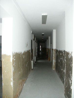 I volumi principali del fabbricato sono rifiniti ad intonaco grezzo mentre i setti murari risultano rivestiti in elementi rettangolari di pietra calcarea a disposizione irregolare. Scossalina sommitale di raccordo con la copertura piana, con gocciolatoio in lamiera verniciata color testa di moro. Copertura impermeabilizzata con guaina ardesiata saldata a caldo. Pluviali esterni alla muratura in PVC. Serramenti esterni vetrati lignei verniciati al naturale sulla facciata interna, color bianco esternamente; avvolgibili esterni metallici in corrispondenza delle aule e del corpo adibito a palestra. Pavimentazione interna in battuto di cemento in corrispondenza della sala adibita a palestra, in piastrelle nei corridoi e nelle aule. Paramenti murari interni intonacati color bianco con abbassamento in smalto color bruno.