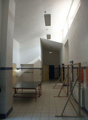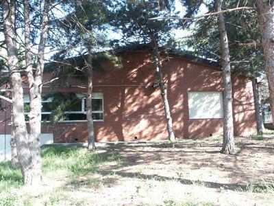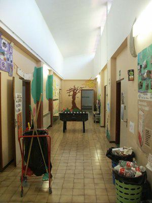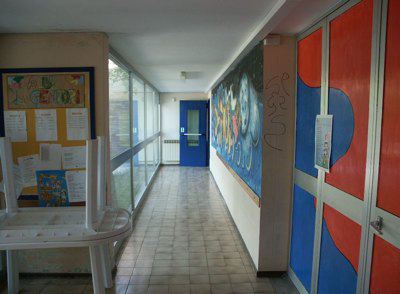 Il fabbricato si colloca nel mezzo di un ampio lotto di pertinenza, posto di poco a nord della piazza centrale di Borgo S. Sergio. L'architettura tipica degli anni sessanta, tendente al razionalismo, si rifà nei materiali utilizzati all'edificato circostante, mostrando in facciata un rivestimento in laterizio accompagnato da ampie porzioni in calcestruzzo armato a vista. La struttura portante è mista in setti e pilastri in calcestruzzo armato, con solai di copertura in laterocemento. La composizione planimetrica si presenta articolata in una serie di corpi edilizi monopiano collegati da un corridoio assiale. I diversi livelli cui sono poste le coperture a falda con manto in coppi curvi rossi, consentono alla luce naturale di illuminare anche le parti più interne dell'edificio scolastico. Ampie finestrature in alluminio consentono un'abbondante illuminazione naturale interna. A nord le sistemazioni esterne sono a verde, mentre a sud si aprono i campi da gioco all'aperto utilizzati soprattutto dal ricreatorio comunale.