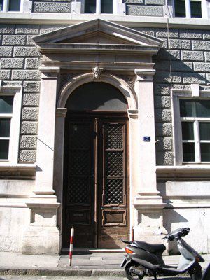 ELEMENTI ORNAMENTALI (esterno) Decorazioni a motivo floreali a rilievo ornano le lunette dei portali e le specchiature interposte alle finestre dell'attico. MASCHERONI (esterno) Panduri raffiguranti volti umani sono collocati in chiave d'arco dei portali d'ingresso. COLONNE (esterno) Colonne addossate di ordine tuscanico sostengono la trabeazione dei portali d'ingresso in Piazza Hortis e via Diaz. SEMIPILASTRI (esterno) Semipilastri di ordine tuscanico sorreggono la trabeazione dei portale in via dell'Annunziata e Via San Giorgio.