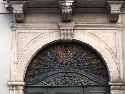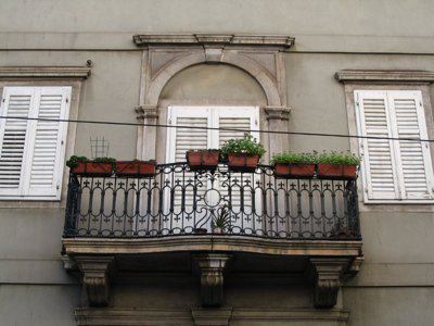 BALCONE (esterno) Balcone con ringhiera in ferro battuto. MENSOLE (esterno) Tre mensole a voluta sostengono il balcone del primo piano.