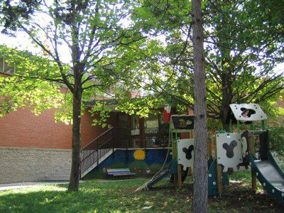 La scuola materna di Borgo San Sergio si trova nel centro dell'omonimo rione. Il fabbricato sorge all'interno di un lotto di forma irregolare; da un lato confina con la Via Curiel ed è separato da essa con una ringhiera; sugli altri lati confina con un parco pubblico delimitato da un muro di contenimento in cemento armato. Le aree esterne sono lasciate a prato; i percorsi interni al giardino sono asfaltati. Il fabbricato si compone di due volumi ad un solo livello architettonicamente identici. Le strutture verticali sono in cemento armato e laterizio; le facciate esterne sono rivestite da elementi in cotto. La copertura è a falde inclinate con struttura in cemento armato e manto di copertura in coppi curvi rossi. L'architettura molto semplice ed è caratterizzata da ampie fasce finestrate.