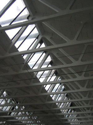 L'edificio, costituito da due volumi di altezza diversa, presenta tre fronti rifiniti ad intonaco ed uno, invece, in mattoni faccia a vista intervallati da fasce orizzontali in pietra. La composizione di questo prospetto sul viale Sanzio, inoltre, viene scandito verticalmente da paraste rivestite in pietra. Agli angoli sono collocate colonne, anch'esse rivestite con lastre lapidee, che terminano con elementi cilindrici di forma e dimensioni diverse. Sempre su questo fronte si sviluppa un basamento lapideo trattato a bugnato, la cui altezza varia con la pendenza dell'asse stradale, fino a diventare un muro in conci lapidei e mattoni che costituisce il limite dell'area rispetto alla strada. I serramenti sono metallici con specchiature, alcuni tamponati da una griglia metallica, mentre al di sotto della copertura diventano solamente dei piccoli fori quadrati. Anche i lati corti presentano paraste che si alternano ad aperture a tutta altezza con serramenti in metallo verniciati. Sul prospetto del volume più basso su via San Cilino viene ricavato l'ingresso alla zona uffici, coperto da una mensola lapidea. Il fronte lungo interno è caratterizzato da una serie di forature regolari ed omogenee, con serramenti metallici, mensole in pietra e avvolgibili verdi, e da una bussola d'ingresso, anch'essa metallica con vetratura opaca. A livello della linea di gronda si articola una cornice lapidea liscia, in aggetto, che sottolinea l'attacco della copertura. Questa risulta essere piana nel volume più basso, mentre nell'altro è costituita da una sequenza di capriate a shed in cemento verniciate di bianco, con lucernai su una delle falde inclinate. Sui due lati corti si innalza un timpano trapezoidale, intonacato della stessa tonalità delle facciate, e con un profilo lapideo sui bordi. Vi è anche un camino di forma regolare a base quadrata piuttosto alto, con griglia a coda di rondine. La copertura è completata da un sistema di gronda e pluviali in lamiera verniciata. Il pavimento esterno è asfaltato, mentre quello interno è in battuto di cemento. L'edificio è rialzato leggermente rispetto la quota del piazzale per mezzo di un marciapiede in cemento. Le pareti interne, sui due lati lunghi, sono intonacate in grigio nella parte inferiore.