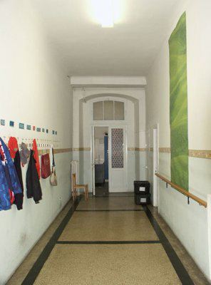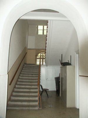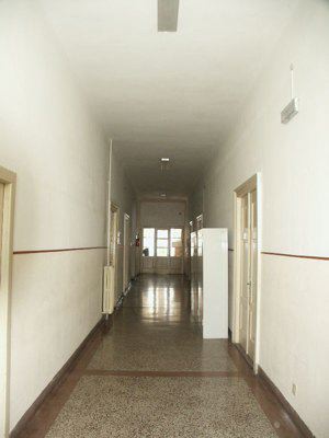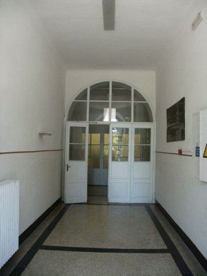 Sulla facciata principale esposta a sud-ovest, una scala in pietra con balaustra metallica verniciata, disposta in maniera simmetrica rispetto al prospetto, permette di raggiungere il piano terra rialzato e l'ingresso principale, posto al centro della facciata. Un piccolo basamento in muratura di pietra arenaria a vista sottolinea lo stacco del fabbricato dal terreno sistemato. Un ulteriore abbassamento in lastre di pietra arenaria, posto a correre lungo l'intero perimetro del fabbricato, all'altezza del solaio del piano terreno, protegge l'intonaco dagli agenti atmosferici. Un finto bugnato liscio ad intonaco segna il livello del piano terreno ed è delimitato superiormente a un marcapiano modanato ad intonaco. La restante parte della facciata è trattata ad intonaco liscio, sino alla fascia di coronamento, costituita quest'ultima da una modanatura in elementi di pietra arenaria. Gronde e pluviali sono in lamiera. La copertura a falde presenta un manto in coppi curvi uso Trieste ed una banchina in pietra. Solo il corpo aggiunto, disposto su un unico livello fuori terra, non presenta fascia di coronamento e lascia in vista i puntoni lignei di copertura con il relativo tavolato. Il portone di accesso, posto in posizione assiale sulla facciata principale, si presenta a due ante vetrate lignee più sopraluce semicircolare vetrato. Le specchiature vetrate risultano protette da elementi decorativi in ferro battuto. I serramenti del piano terra presentano doppie ante vetrate lignee verniciate in colore bianco a otto specchiature, con sopraluce vetrato apribile a vasistas Esternamene gli elementi oscuranti uso Trieste completi di lunetta superiore in legno verniciato verde, risultano montati su una controcassa esterna. Al primo piano i serramenti doppi lignei a sei specchiature, con anta esterna montata su controcassa lignea, sono incorniciati da elementi squadrati e bulinati in pietra bianca, con architrave modanato e gocciolatoio a protezione degli agenti atmosferici. All'ultimo piano i serramenti, dello stesso tipo di quelli del primo livello, risultano semplicemente incorniciati da elementi in pietra bianca bulinata; permangono in alcuni casi gli oscuranti esterni uso Trieste in sostituzione delle ante vetrate esterne dei serramenti. All'interno nell'atrio di ingresso un grande serramento ligneo vetrato con sopraluce semicircolare separa la zona di accesso dal corridoio interno. I pavimenti delle parti comuni sono in battuto di cemento e graniglia, mentre le murature trattate ad intonaco presentano un abbassamento in smalto murale. La scala di accesso ai piani superiori presenta gradini in pietra bianca bocciardata, con parapetto metallico e corrimano ligneo verniciato al naturale. I serramenti interni delle aule, originali lignei a doppia anta a sei specchiature opache, risultano verniciati in color crema. Le aule presentano pavimentazione in parquet ligneo disposto a spina di pesce.