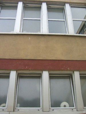 L'edificio presenta tutti i fronti in cemento a vista, eccetto il livello del pianoterra verso il piazzale che è rifinito ad intonaco tinteggiato color crema. Il passaggio porticato presenta una tinteggiatura di due tonalità differenti: color crema nella parte inferiore, bianca in quella superiore in corrispondenza delle forature. La copertura piana è completata da un sistema di grondaie e pluviali verniciati. La composizione dei prospetti viene scandita orizzontalmente da fasce in cemento a vista e da finestrature a nastro in metallo, che si sviluppano per tutta la lunghezza dei fronti. Lo spazio antistante gli ingressi del primo livello è delimitato da un parapetto in cemento che presenta alla base una sequenza di forature rettangolari. Al pianoterra gli infissi metallici sono costituiti da serramenti a tutt'altezza con specchiature vetrate sul fronte verso il piazzale, da porte a doppio battente su quello laterale. Anche le finestrature continue presentano serramenti metallici verniciati di colore scuro. Gli infissi del secondo piano sono stato sostituiti con serramenti in alluminio. All'interno del complesso si estende un'ampia area adibita a parcheggio, con un pavimento in cemento; l'accesso all'interno avviene alla stessa quota del piazzale.
