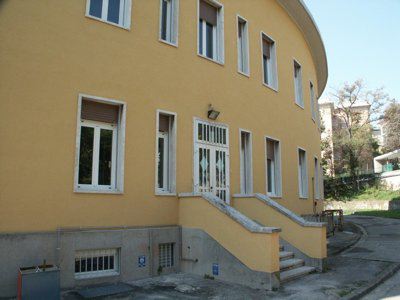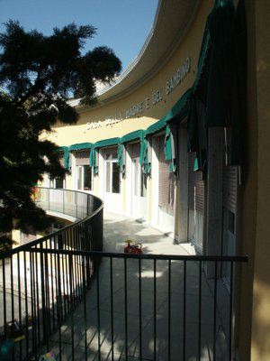 Il fabbricato, del tipo isolato su lotto di pertinenza, si inserisce in una zona periferica della città di Trieste, caratterizzata da alti fabbricati residenziali posti su lotti di pertinenza con giardino. Il corpo di fabbrica stereometrico, sviluppato su due piani fuori terra più un livello interrato, è progettato su una pianta a forma di settore circolare ed espone la facciata principale verso sud. La composizione di facciata sottolinea gli elementi orizzontali: la fascia basamentale, il balcone del primo piano e la linda in aggetto. La struttura è in muratura portante, con solai in laterocemento e balconi sporgenti con solette in calcestruzzo armato. La copertura è piana. La distribuzione interna avviene a partire da un atrio passante posto in posizione centrale, lungo un corridoio ad arco che attraversa tutta la lunghezza del fabbricato. Il vano scala, posto in prossimità dell'affaccio nord, è accessibile direttamente dall'atrio di ingresso. Le aule della scuola materna sono posizionate al primo piano, con affaccio a sud, sulla terrazza. Al piano terra sono sistemati gli uffici ed i principali spazi collettivi. Il piano interrato ospita tutte le funzioni di servizio e gli apparati tecnologici.
