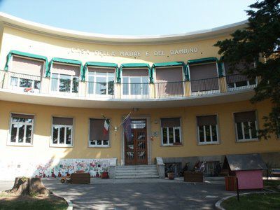 ISCRIZIONE (esterno) Sull'affaccio principale, nello spazio compreso tra le porte-finestra del primo piano e l'aggetto del coronamento, a caratteri stampatello bianchi rifiniti in intonaco è riportata la seguente dicitura: "CASA DELLA MADRE E DEL BAMBINO".